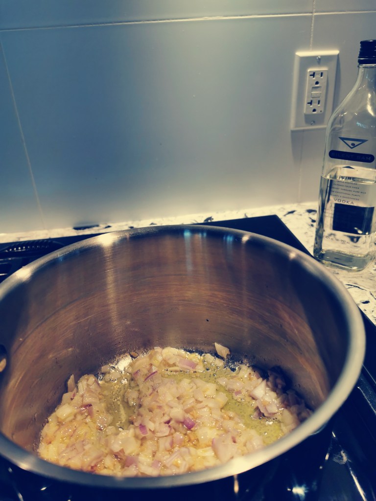Add vodka and simmer 2-3 more minutes or until it is cooked down to about half.