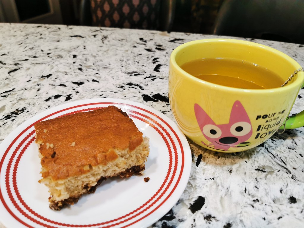 The cake was chosen because I had some bananas that were very, very ripe, and like any other millennial, I don’t like to waste if it can be avoided. I needed to do some baking! This is an old recipe that my mom has been making for years, and I would be lying if i said it wasn’t a total comfort food for me. And after the last few weeks, a good comfort food was definitely on the menu. I added a cup of Kashmiri Chai tea from the Naked Leaf to help in achieving full on comfort mode.
