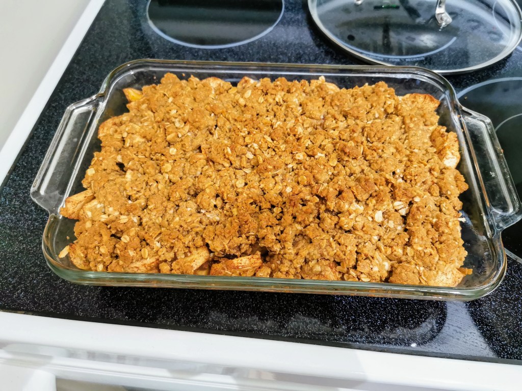 Add Flour, brown sugar, remaining cinnamon, oats, and salt to bowl. Use an electric mixer, forks, or your hands to incorporate the butter into the bowl. Mix until the mixture is chunky and crumbly.