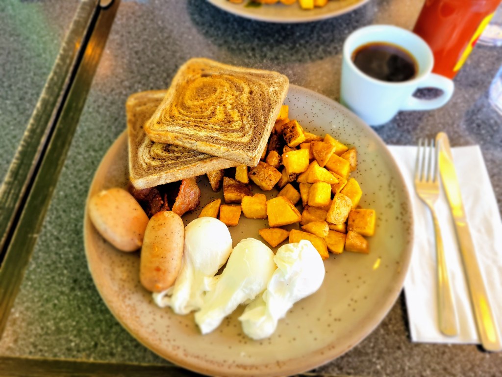 If you’re ever wondering what I order at brunch spots, eggs benedict is the most likely answer. However, I’m trying to broaden my horizons so I went with something simply called the farmers breakfast. 3 eggs, house cured bacon, duck fat hash, toast, and chicken and apple sausage.