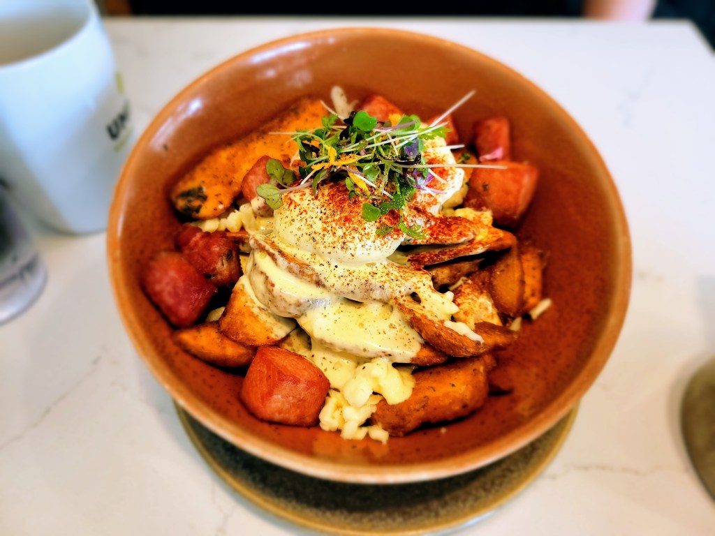 My brunch partner got the Gold Digga. Now, this is a hearty dish. It has Poached eggs, Berkshire roast pork, Saint Cyrille curds, brown butter hollandaise and black truffles. Now, Truffles are something that are VERY hit and miss for my. They are a strong flavour and I find that most chefs will use them simply because they would like to up the perceived value of a meal or dish. They tend to overpower what I’m easting and really take away from the meal as a whole. However, truffle and potatoes is a match made in heaven. Naturally it would go really well with the duck fat fried potato wedges in this dish. *This is a personal opinion and in no way based in any kind of culinary training or professionalism*