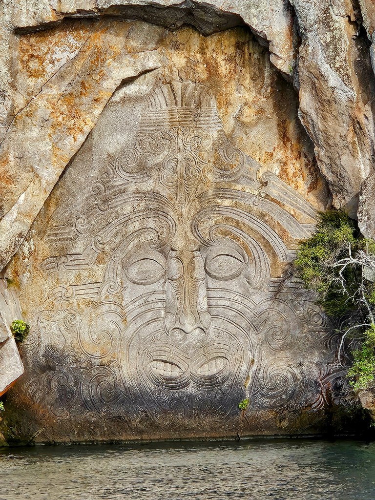 The Māori rock carvings were carved by Matahi Whakataka-Brightwellin the 1970’s. It was carved in the likeness of Ngātoro-i-rangi, a navigator who guided Māori tribes to the Taupō area over a thousand years ago according to Māori legend. The carving is intended to act as a protector to the lake against the volcanic activities underneath. This is an active volcanic area with the Taupō volcano being on the far side of the lake.